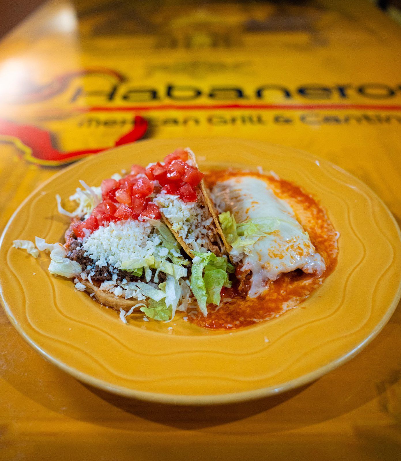 Corn tortilla shell, topped with ground beef in a mild red sauce. Served with lettuce, tomato & añejo cheese.